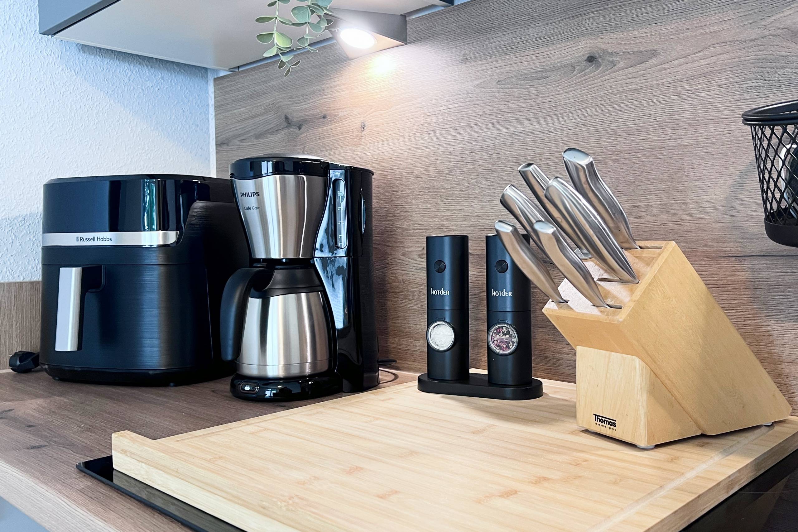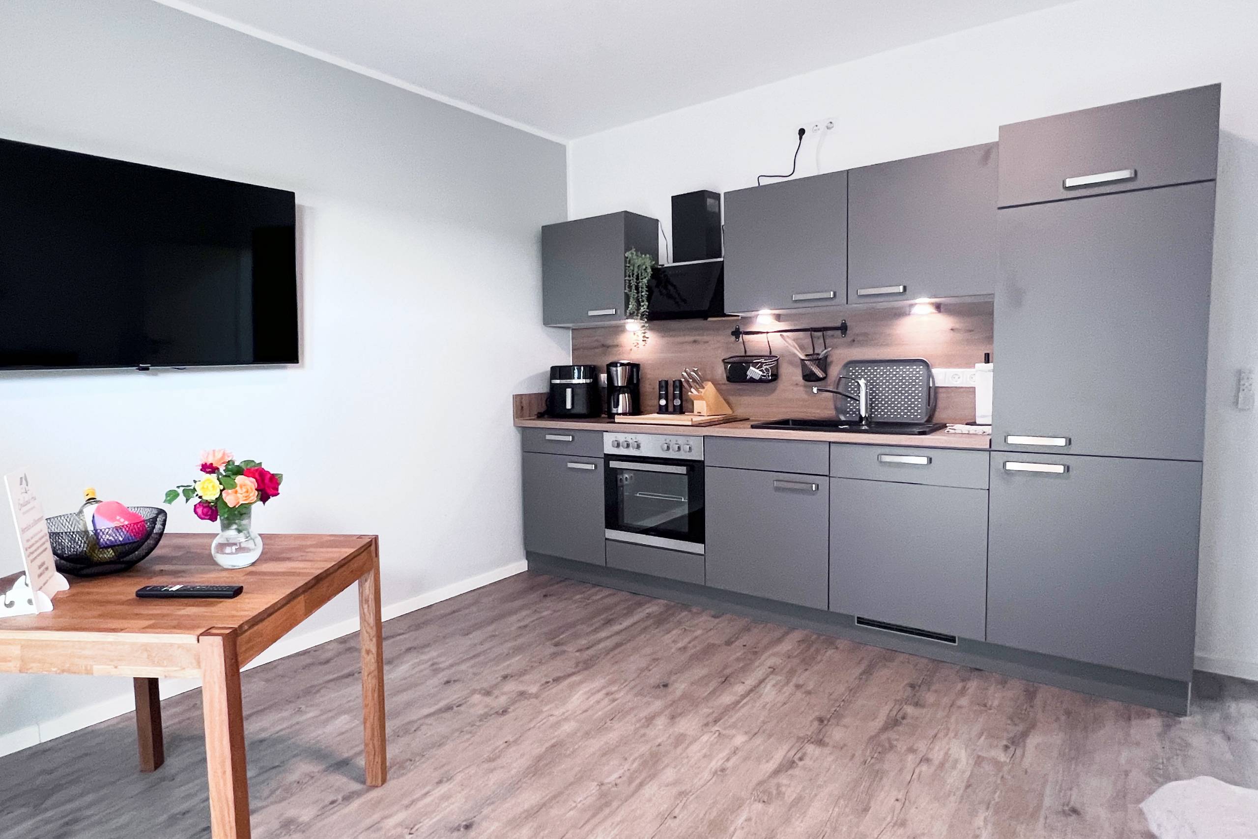 Unsere moderne Küche bietet alles für Ihren Hunger. Nur einkaufen müssen Sie noch selbst.. Neben unserem Bäcker vor Ort haben Sie in 5km Entfernung mehrere Supermärkte wie ALDI, LIDL, Combi, K+K und mehr.